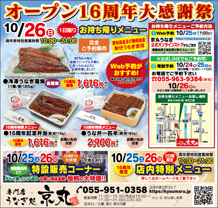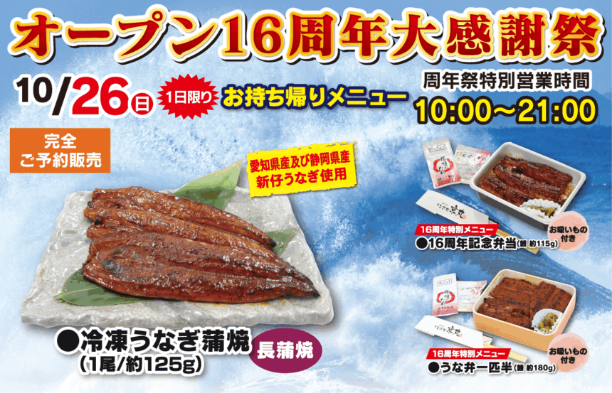 【おいしい】《沼津市春日町/うなぎ処 京丸》 10/26(日)オープン16周年大感謝祭開催